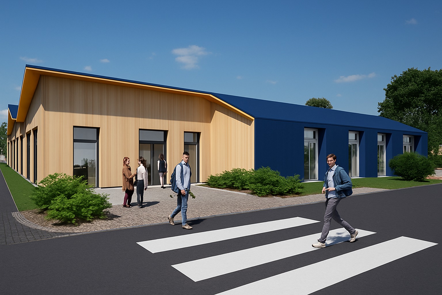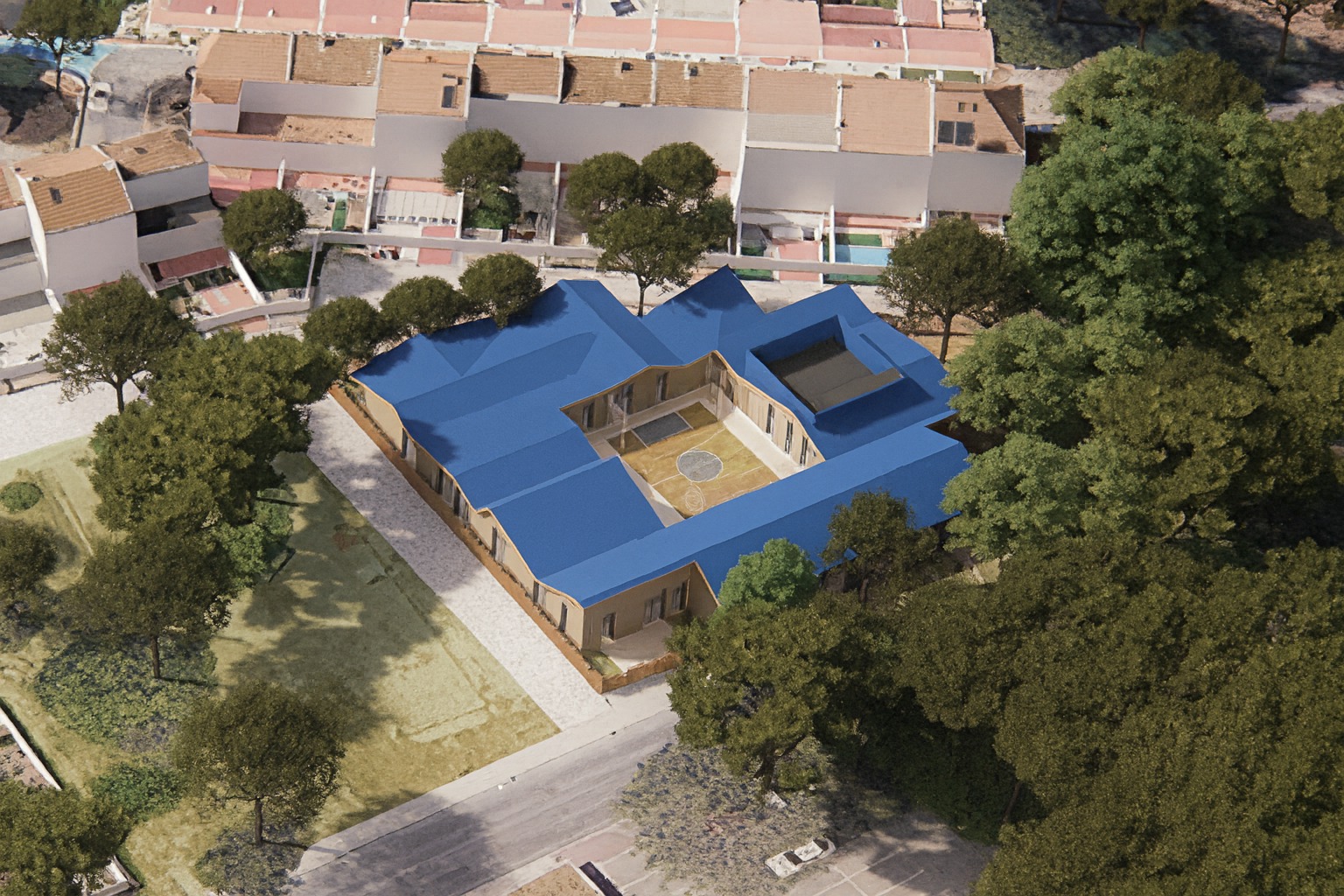 A nova casa inspira-se na identidade do próprio bairro: um edifício que se organiza como uma pequena aldeia educativa, composta por volumes que dialogam entre si, telhados que se desdobram em várias águas e percursos que convidam à curiosidade e ao movimento.